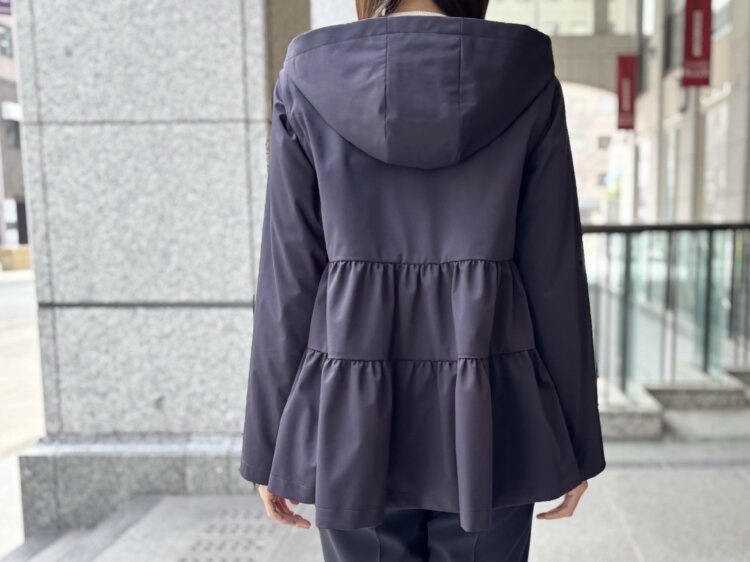 フロントはすっきりとしたジップデザインで端正な印象に、バックスタイルはギャザー切替によるフレアシルエットが女性らしさを引き立てさりげなく着映えを叶えてくれます。