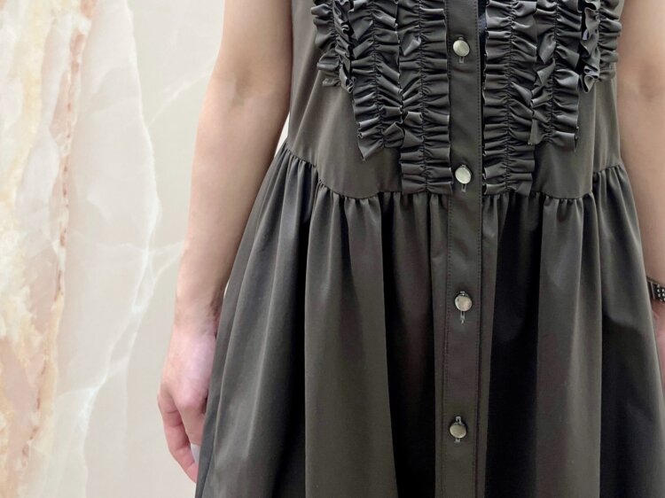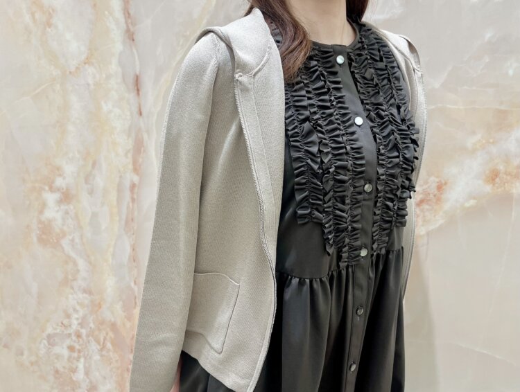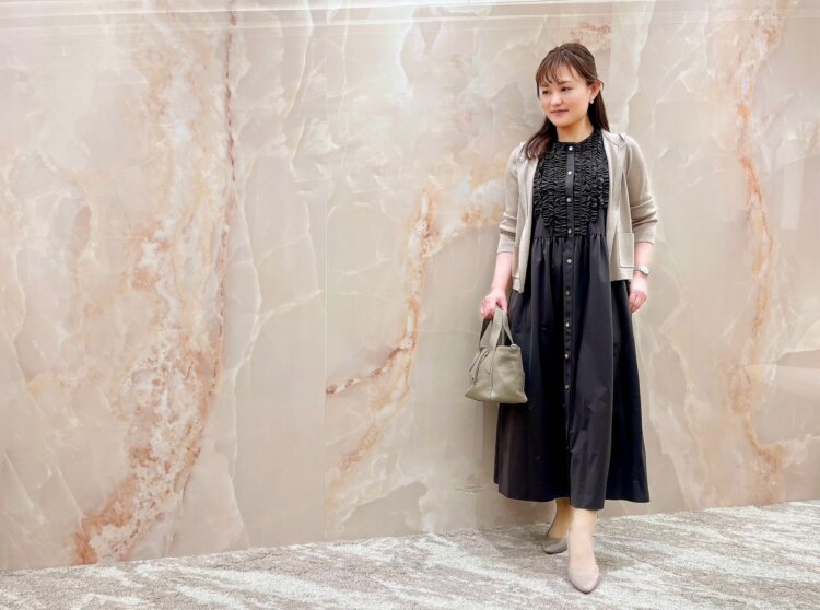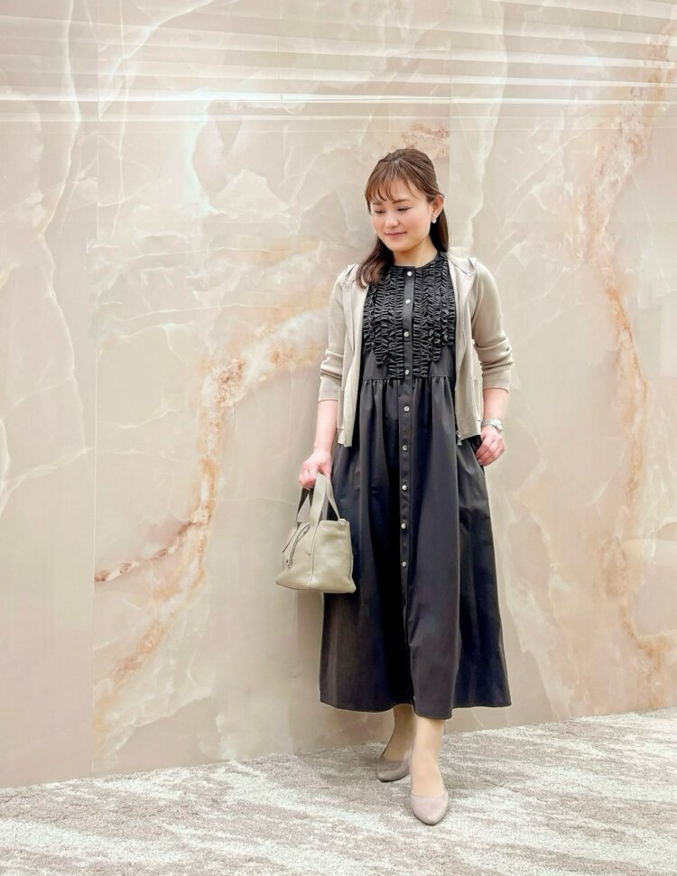 落ち着きのあるブラウンのワンピースにやわらかなベージュの羽織りを合わせることで、季節感はそのままに、甘すぎないフェミニンスタイルに仕上げたコーディネート。フロントにあしらわれた繊細なフリルは、縦ラインを強調してくれるので、スタイルアップ効果も◎フレアシルエットが動くたびに女性らしさを引き立ててくれます。
