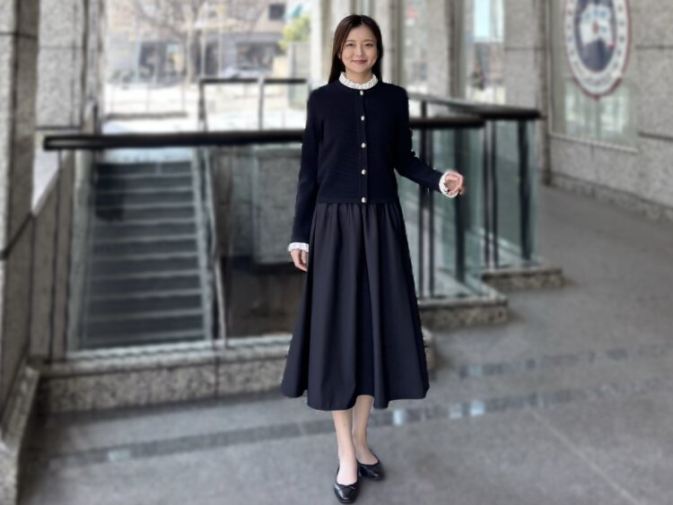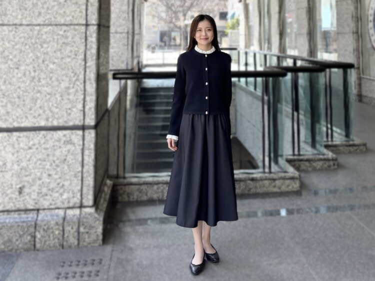 通勤やお食事、セレモニーシーンにもおすすめの上品な装いです。