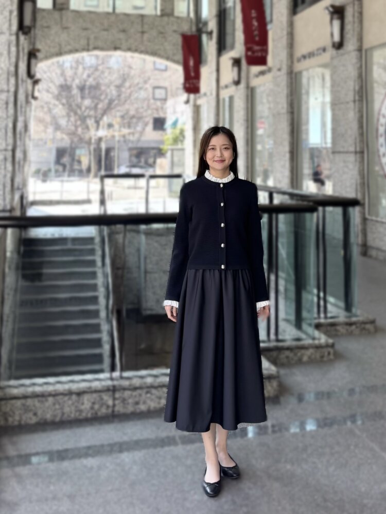 落ち着いたネイビーのワントーンでまとめながらも、さりげないフリルディテールが女性らしさを引き立ててくれるコーディネート。