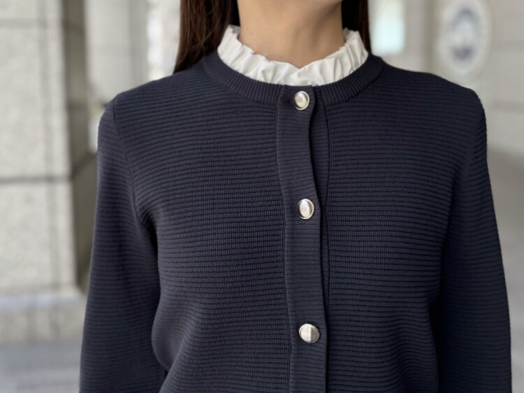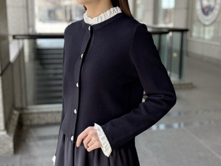 今回はフリルを付けたまま着用し、ネイビーの端正な印象にほんのりと華やかさをプラスしました。