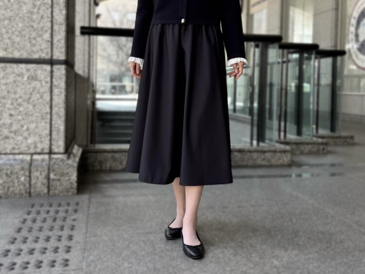 ボトムスには、ウエストゴムギャザーフレアスカートを合わせました。