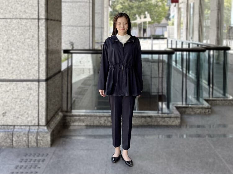 お仕事シーンから休日のお出かけまで幅広く対応できる、まさに“理想のネイビーコーデ”です。