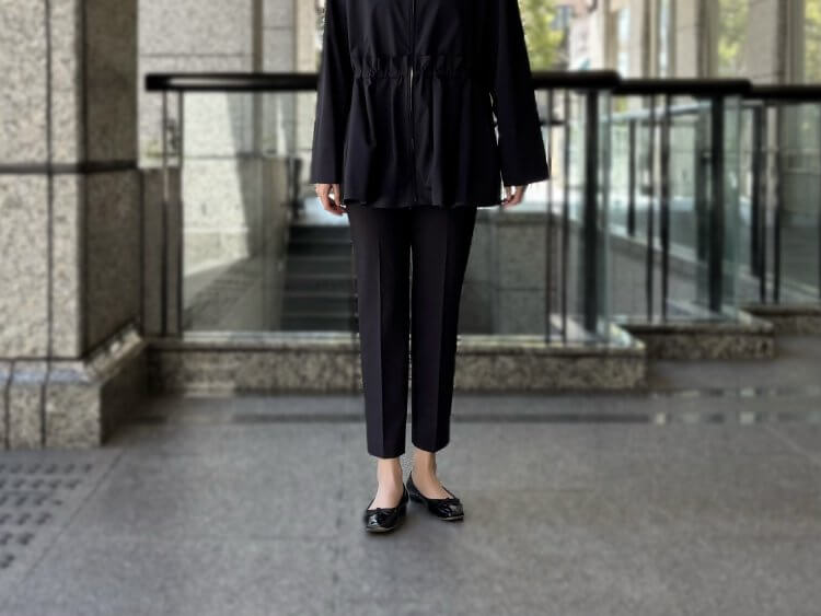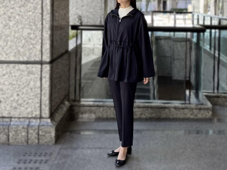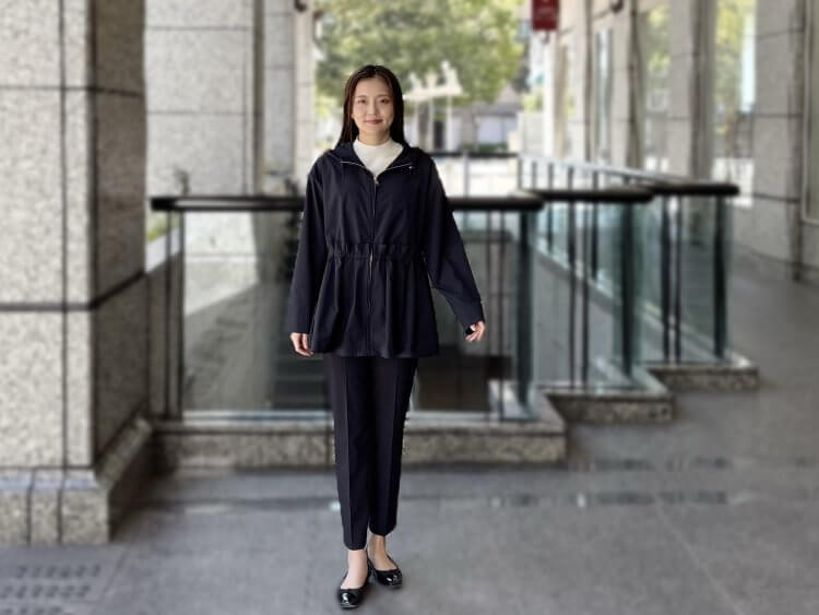 今回は、ネイビーのテーパードパンツと合わせてワントーンでまとめ、すっきりとした印象に仕上げました。