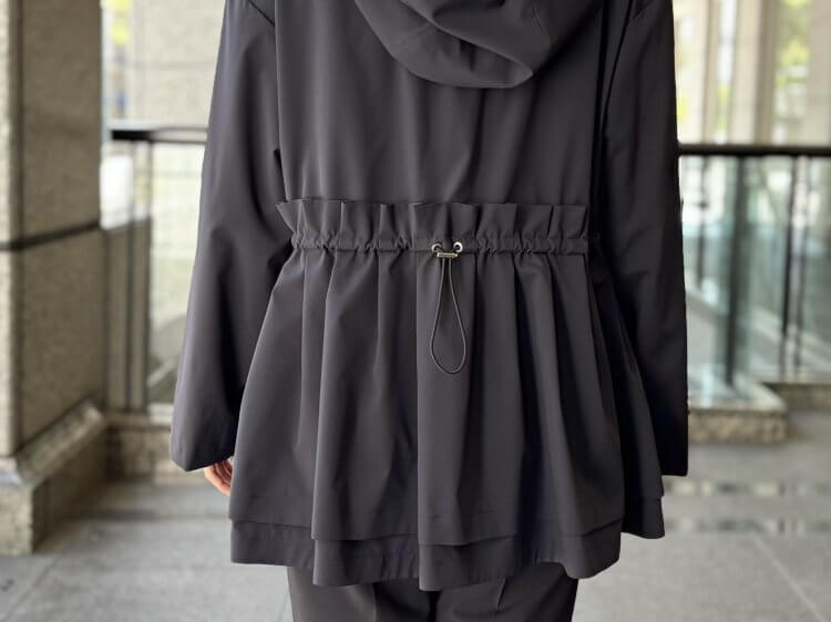 ウエスト位置にはドローコードを配し、絞ることでシルエットに自然な立体感を生み出します。