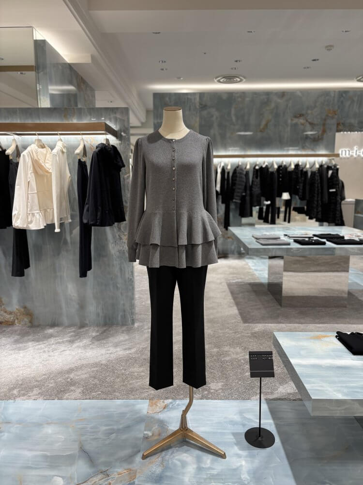 一枚で着てもスタイリッシュに決まり、同素材のクルーネックカーディガンとのアンサンブルスタイルなら、より統一感のある上品な装いに。