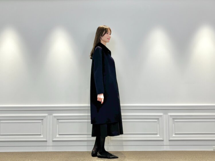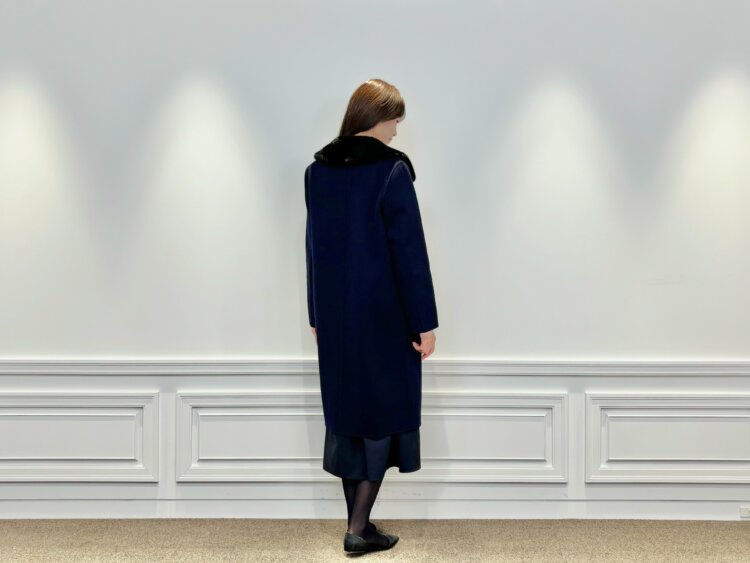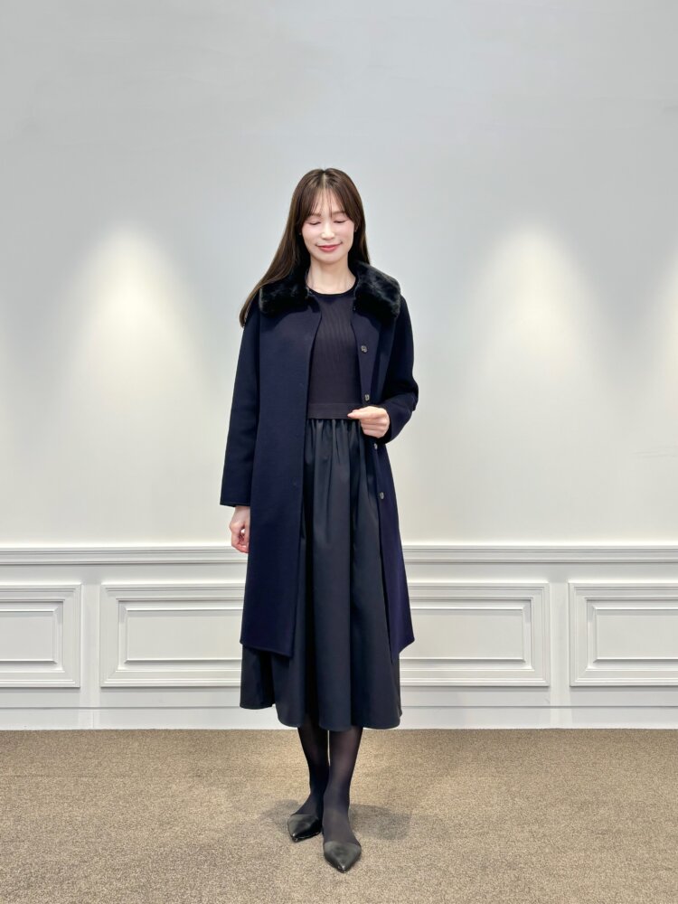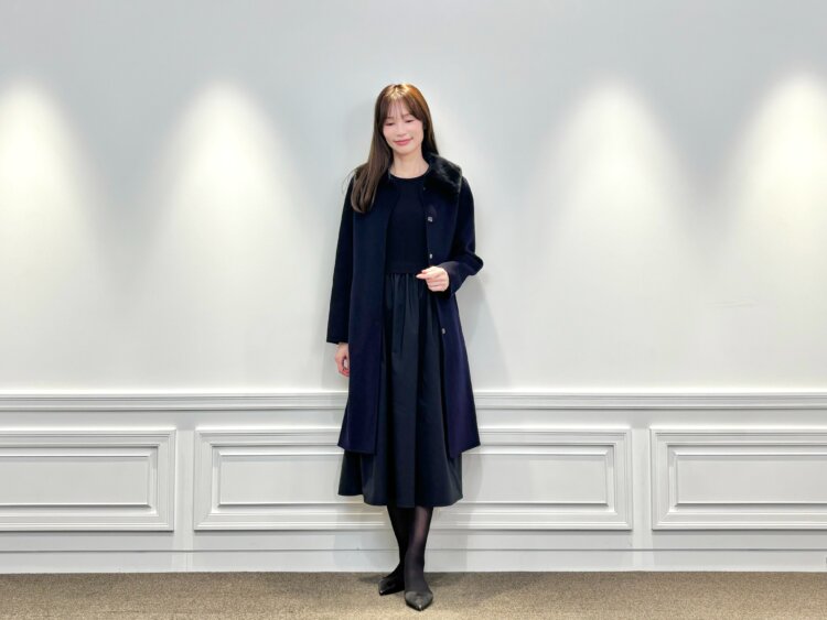 その上から合わせたのは、ファーカラーが上品なロングコート。同じネイビーカラーでまとめることで、落ち着きと統一感のある装いに仕上がります。ファーの柔らかな表情が加わることで、シンプルな配色でも華やぎを感じさせてくれます。