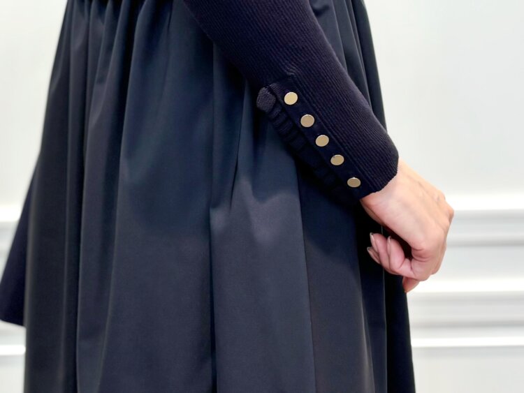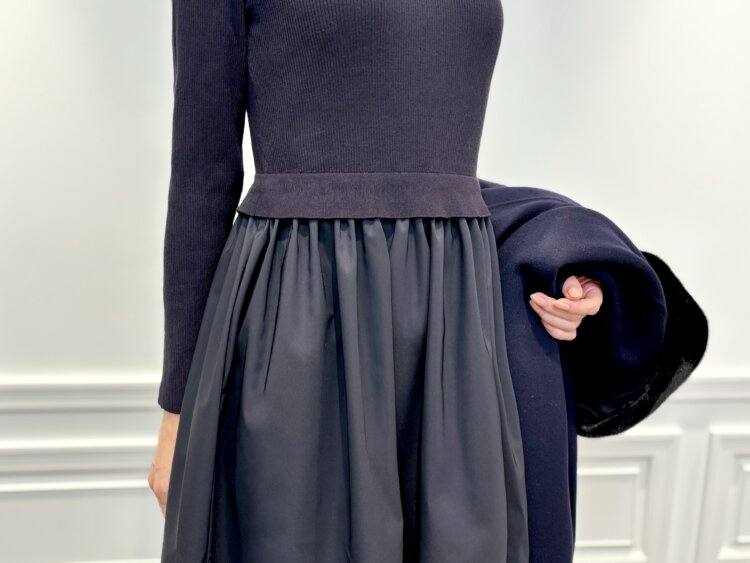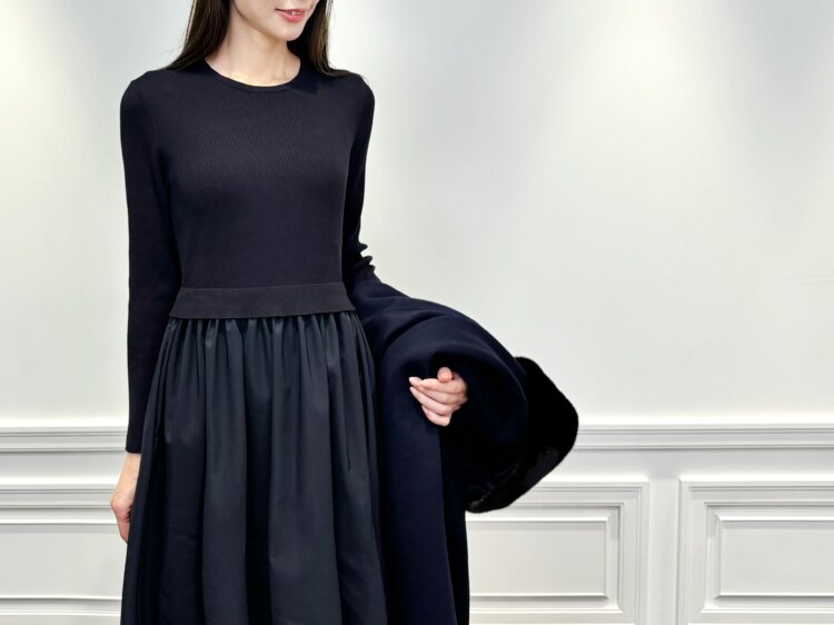 上身頃はリブニット、スカート部分はふんわりと広がるドッキングデザインのワンピース。1枚でコーデが完成する手軽さがありながら、程良く身体に沿うリブニットがすっきりとした印象で、動くたびに揺れるスカートが、女性らしさを添えてくれます。
