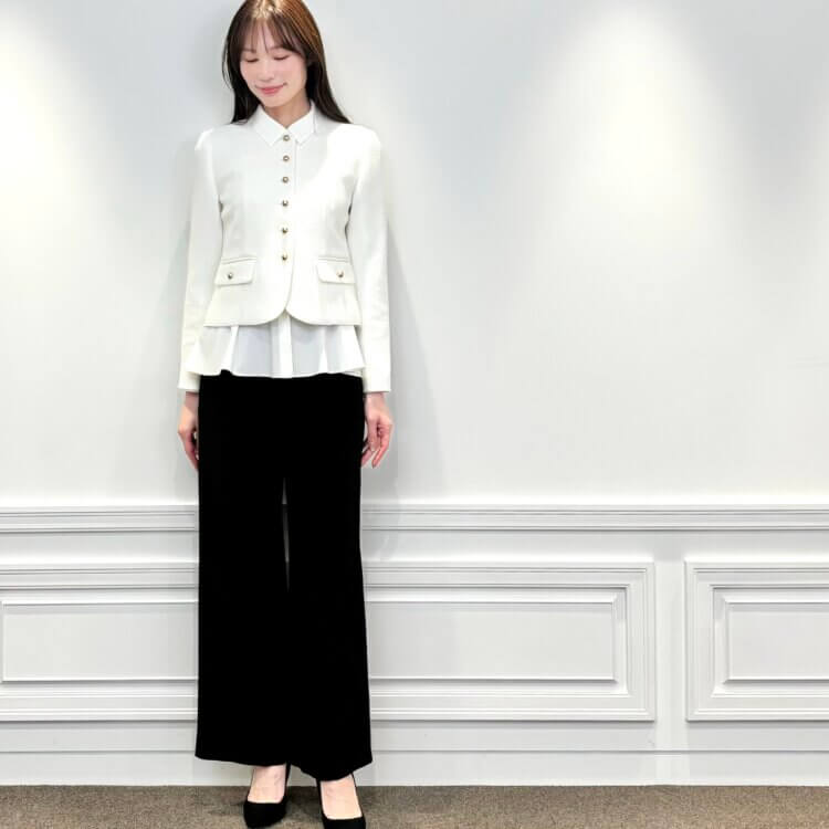 フリルデザインや適度にハリのある素材を使用しているので、きれいめのアイテムともバランス良く合わせてコーディネートして頂けます。