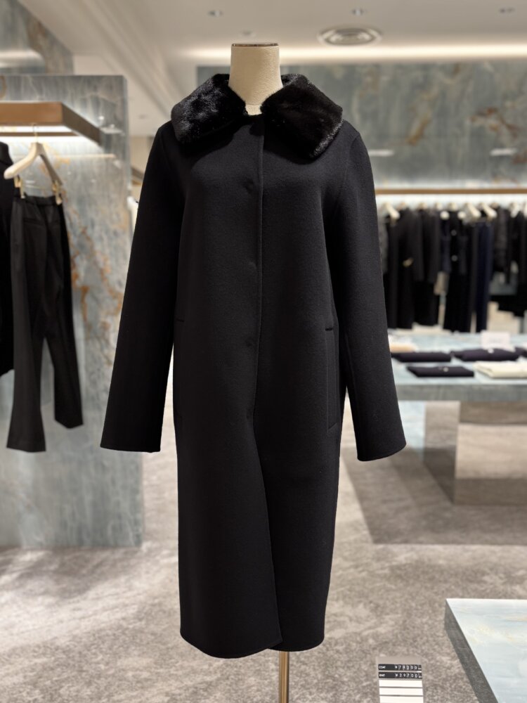ふんわりとしたフェイクファーの襟が冬の装いに柔らかな華やぎを添え、顔まわりを明るく魅せてくれます。