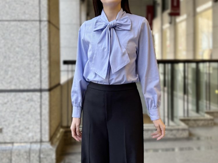 ボウタイリボンが華やかさをプラスしながらも、ロイヤルオックスフォード生地の上品な光沢感とヨークデザインが相まって、オフィスにふさわしい端正な印象を演出します。甘さときちんと感のバランスが絶妙で、シンプルなボトムスと合わせるだけで一気に洒落感が漂います。