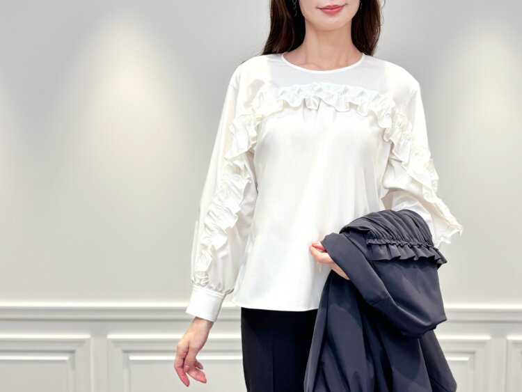 胸元にたっぷりとあしらわれたフリルが、やわらかな生地感とともに女性らしい華やかさを演出してくれます。動くたびに軽やかに揺れるフリルが、シンプルな装いの中にも上品な印象をプラスします。