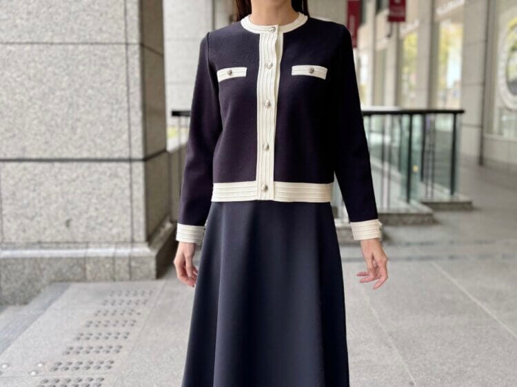 上品なバイカラーデザインがクラシカルな印象を与えるニットジャケット。