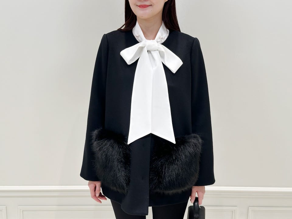 ふんわりとしたボア素材で仕立てたショート丈コート。