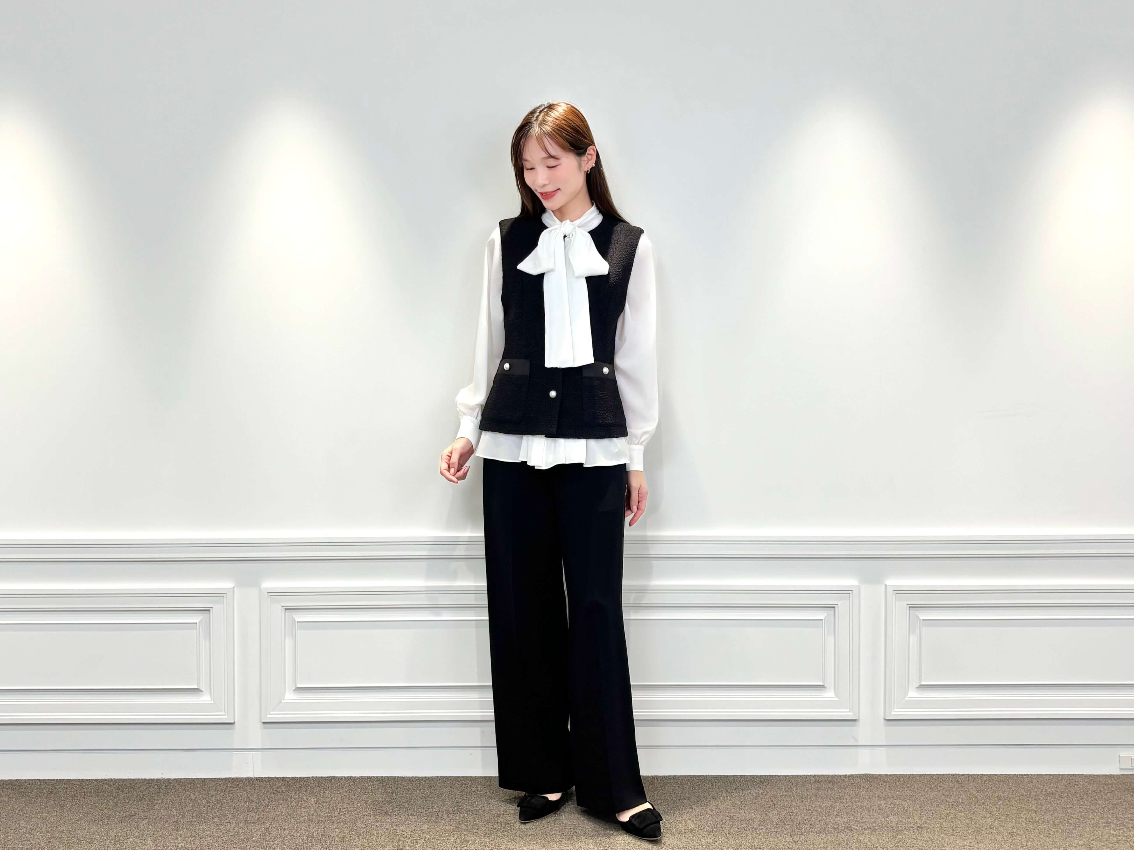 フロントを比翼仕立てにしたジレは、どんなインナーとも好相性で、タートルやブラウスなど合わせるアイテム次第で印象を変えられる万能な1枚。