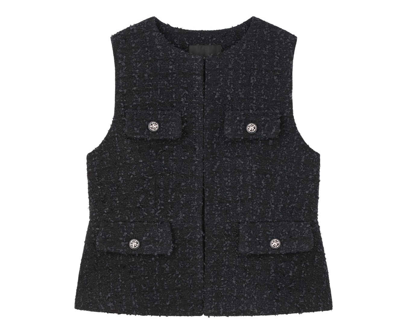 上質ツイードの風合いとメタルボタンの輝きが魅力のジレ。羽織るだけで装いに深みを与え、シンプルなコーデも上品に格上げします。季節の変わり目に重宝する、大人のための万能レイヤードアイテムです。