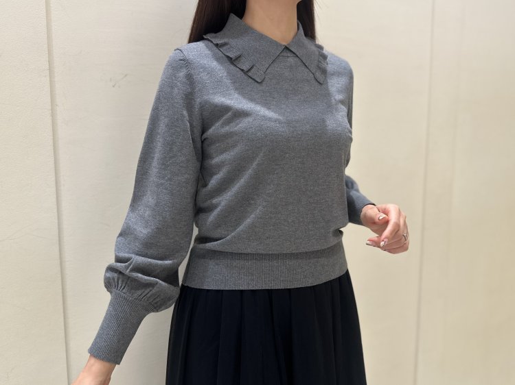 上品なフリルカラーがポイントのニットプルオーバー。