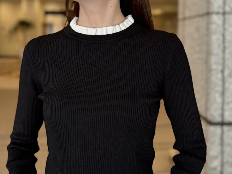 首元&袖口のバイカラーのフリルがエレガントな印象を添えるリブニットプルオーバー。レーヨン混でドライな肌触り、程よくフィットするコンパクトシルエットなので、ワイドパンツなどとのバランスも抜群。オンオフ問わず使いやすい一枚です。