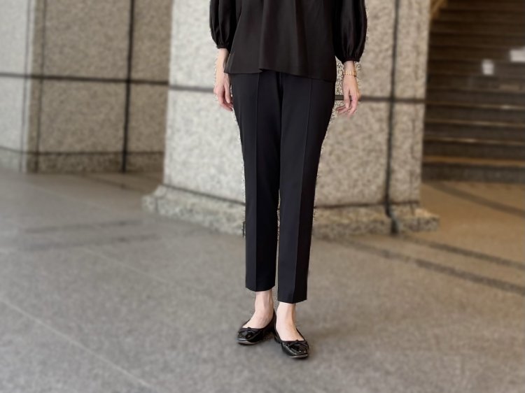 センタープレスが効いているので、ブラックコーデでものっぺり見えず、縦ラインですっきりとした印象に。