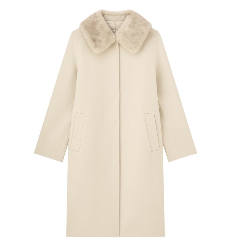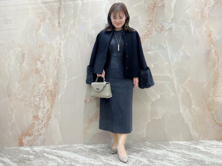 ふんわりとしたフェイクファーの襟が冬の装いに柔らかな華やぎを添え、顔まわりを明るく魅せてくれます。