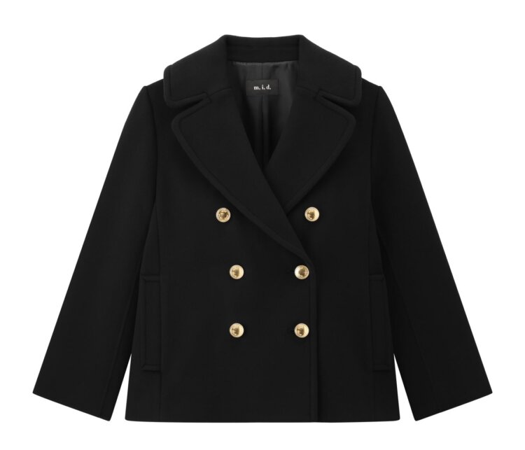 ゴールドボタンが華やぎを加え、短め丈のバランスでワイドパンツからスカートまで幅広くマッチ。