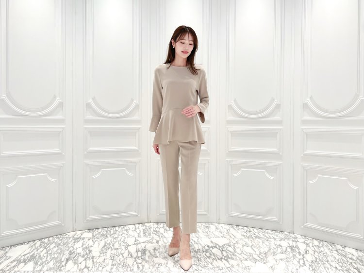 美しいハリと上質感が際立つ一枚。立体的なペプラムが華やかさを添え、同素材のパンツとのセットアップでより洗練された印象に。