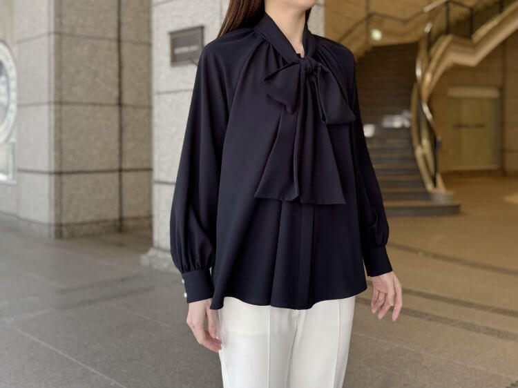 首元に大きめのタイをあしらい、ふんだんにギャザーを寄せたデザインでエレガントさを演出。