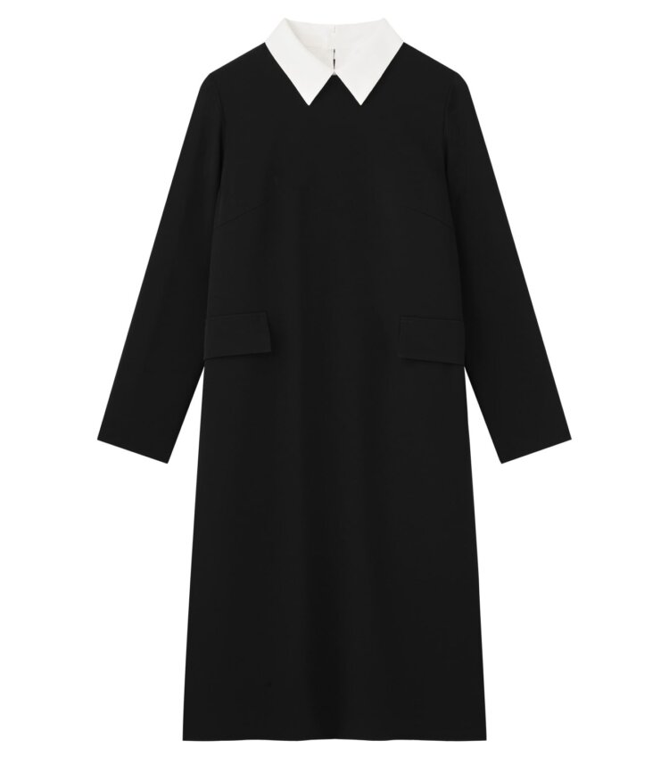 しなやかなダブルクロス素材が大人の上品さを引き立てるワンピース。付け外し可能なホワイトカラーで表情を変えられ、シンプルながら洗練された雰囲気に。身体を美しく見せるシルエットで、日常から特別なシーンまで凛と着こなせる一着です。