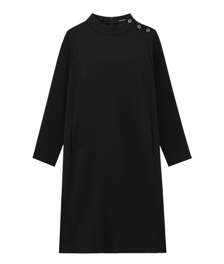 ミニマルなデザインが洗練された雰囲気を引き立てるハイネックワンピース。ほどよい厚みと柔らかな落ち感を備えたダブルクロス生地が、美しい縦ラインを演出します。肩に配したメタルボタンがシックなアクセントとなり、一枚でもスタイルが完成します。