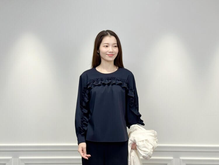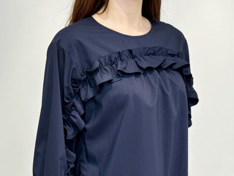襟ぐりと前立てに施されたフリルが華やぎたっぷりなブラウス。