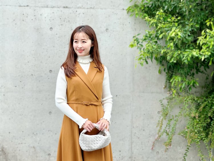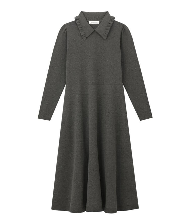 ウエストから自然に広がるフレアシルエットで体のラインを拾いにくく、1枚で品よく決まるのも魅力。