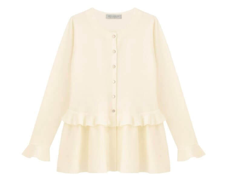 顔周りを優しく彩るフリル襟と、さりげなく艶めくパールボタンが女性らしい華やぎを添えます。