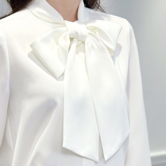 フロントの大き目なボウタイとふんわり感のあるパフスリーブが女性らしい装いに導いてくれるブラウス。