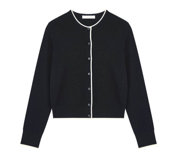 繊細なフリルとピンタックのディテールが印象的な一着です。ブラックのシックな色味に優雅なデザインが加わることで、ワントーンでも単調にならず女性らしい奥行きを演出。ニットならではの柔らかな肌触りで、着心地も快適なうえ、今回のようにフロントを閉じてトップスとしても、また軽い羽織りとしても活躍する汎用性の高さも魅力です。