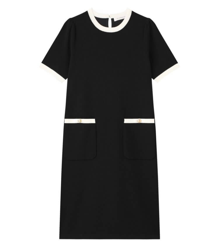 レーヨンをメインに使用したドライタッチなニット素材で仕立てた、上品なバイカラーワンピース。さらりとした肌触りと程よいハリ感が美しいシルエットを引き立てます。ネックや袖口、ポケットの配色とゴールドボタンが華やかなアクセントに。きちんと感があり、通勤からお出かけまで幅広く活躍する一着です。