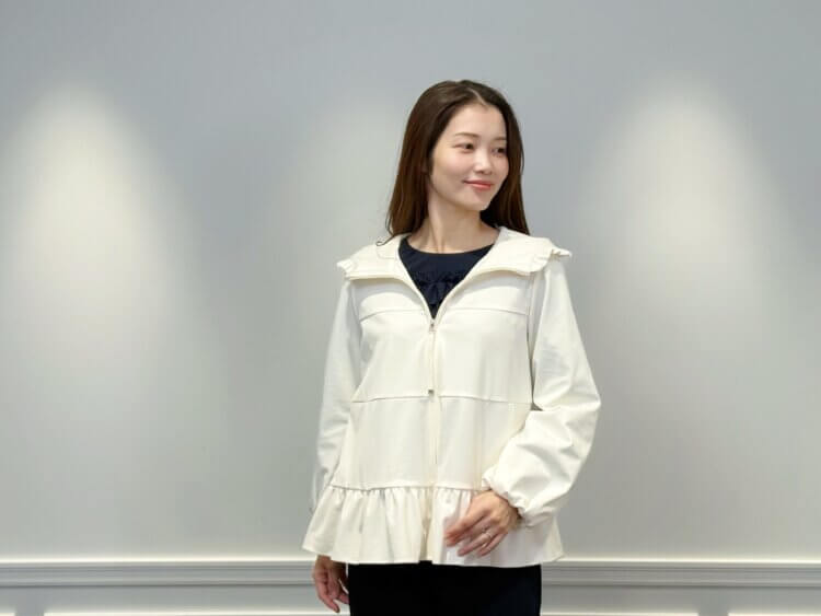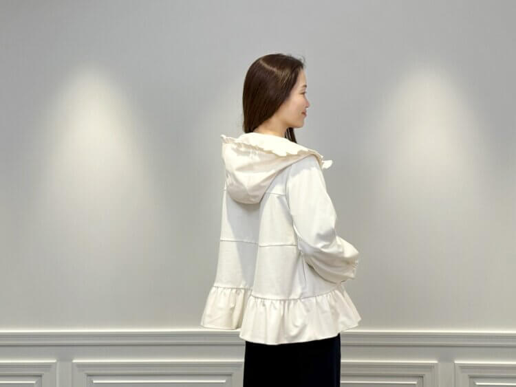 フードと裾に施されたフリルが女性らしいニュアンスを添え、カジュアルなアイテムでありながら上品な印象に仕上がります。