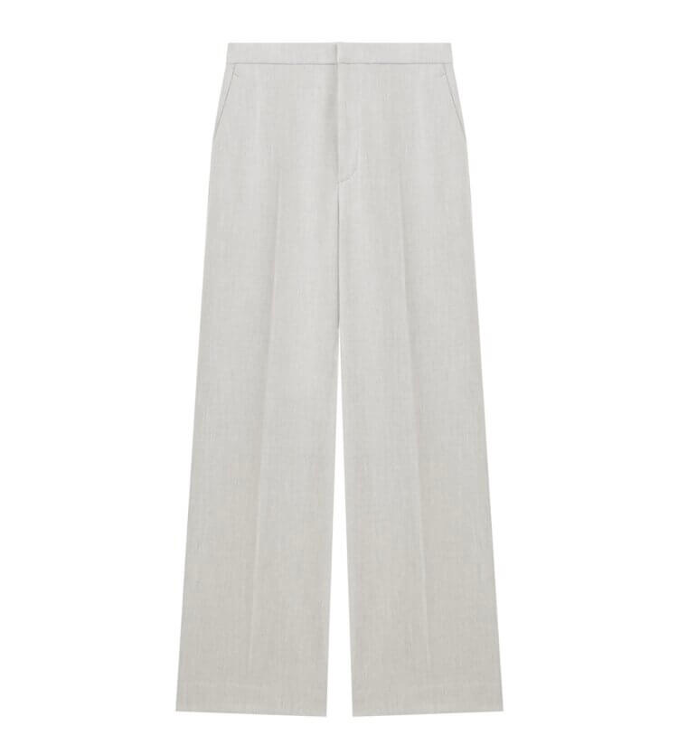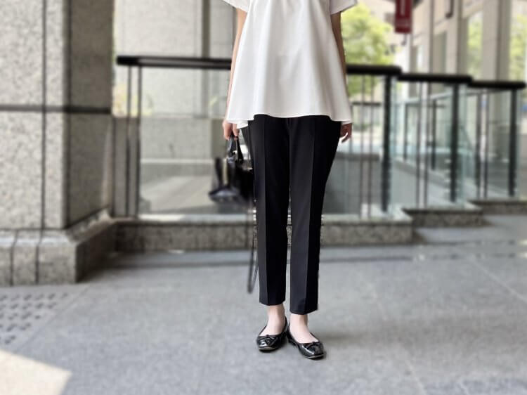 センタープレスが効いた細身のシルエットがきちんと感をプラスしながらも足さばきも軽やかに仕上げてくれます。