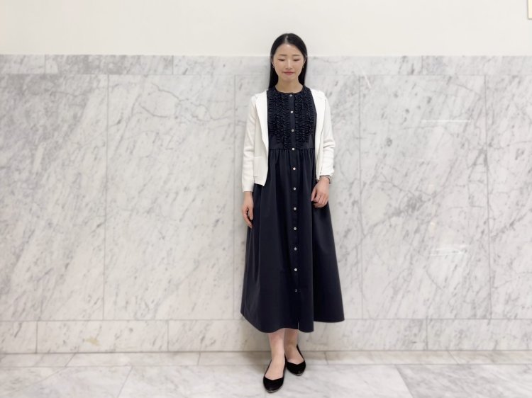 繊細なフリルとピンタックのディテールが印象的な一着です。ブラックのシックな色味に優雅なデザインが加わることで、ワントーンでも単調にならず女性らしい奥行きを演出。ニットならではの柔らかな肌触りで、着心地も快適なうえ、今回のようにフロントを閉じてトップスとしても、また軽い羽織りとしても活躍する汎用性の高さも魅力です。
