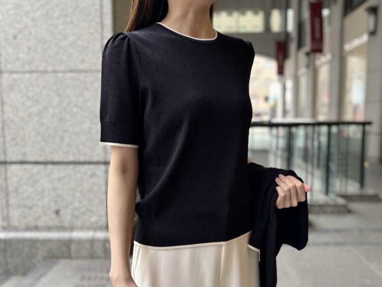 柔らかな風合いのニット素材で仕立てたトップスは、シンプルながらも着るだけで女性らしい品の良さを引き立ててくれるます。すっきりとしたシルエットでボトムを選ばず、デイリーから通勤まで幅広く活躍します。ジャケットのインナーとしても映え、さりげない華やかさを添えながら着回し力の高さを実感できるアイテムです。同素材の<ドット編みニットカーディガン>とアンサンブルでお召しいただくことで、統一感のあるきちんとしたスタイルが完成しオケージョンシーンでも活躍します。
