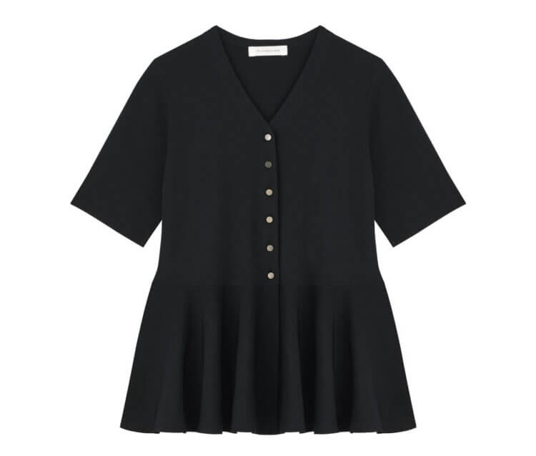 柔らかくしなやかなレーヨンベースのニット素材で仕立てた、上品なペプラムニットプルオーバー。すっきりとしたVネックが顔まわりを美しく見せ、フロントのメタルボタンがさりげないアクセントに ! ウエスト切り替えから広がるペプラムシルエットが、女性らしい立体感を演出してくれます。