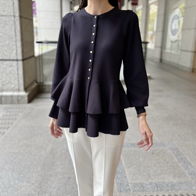 華やかな”パフスリーブボウタイブラウス”はネイビーコーデで綺麗めスタイルに