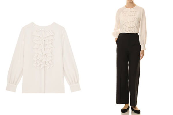 フロントにたっぷりとあしらわれたラッフルフリルが華やかさを添えるブラウス。