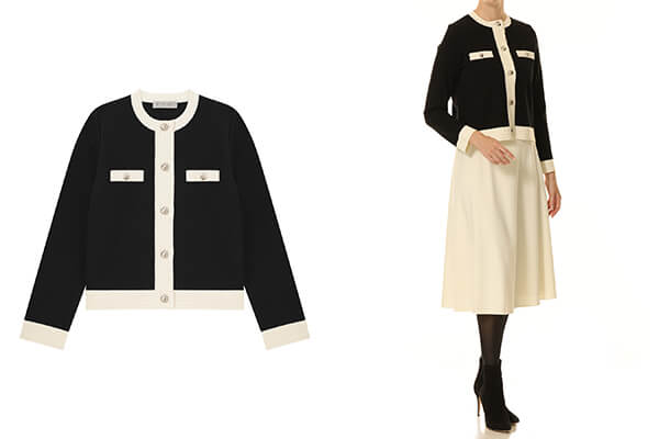 上品なバイカラーデザインがクラシカルな印象を与えるニットジャケット。