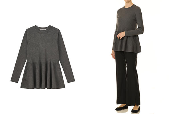 切替部分で編み方に変化をつけたペプラムデザインが、女性らしい立体感を演出するニットプルオーバー。