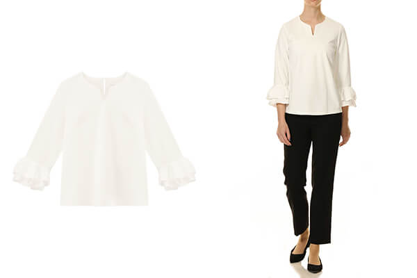 カフスに施したティアードデザインが、手元にさりげない華やぎを添えるエレガントなトップス。
