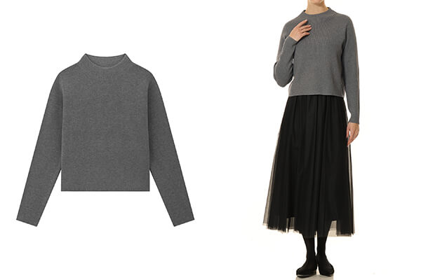 すっきりと首元に沿うボトルネックがお顔周りをすっきりと見せてくるニットプルオーバー。
