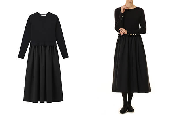 上身頃に伸縮性の高いリブニット、スカート部分に上品な光沢を放つ布帛素材を組み合わせた、