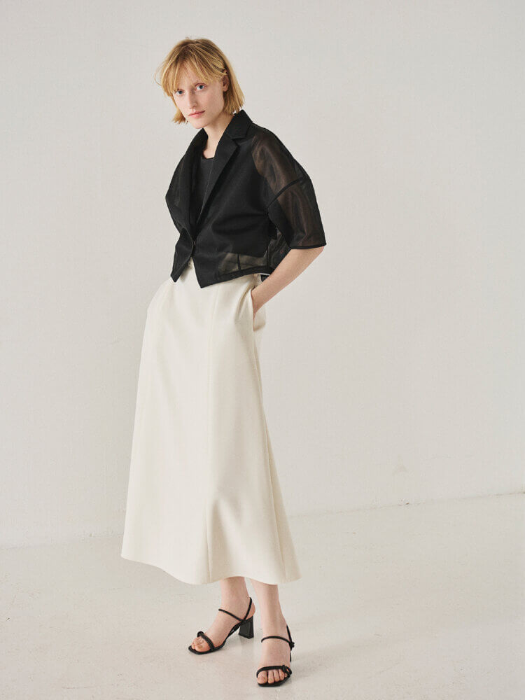 適度なハリ感とふんわりとした柔らかなタッチが共存し、シアーな質感が装いに抜け感と奥行きをもたらします。