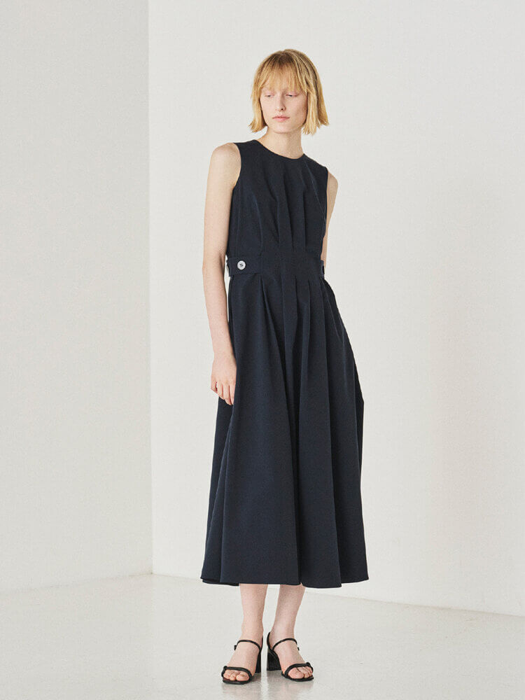 ウエスト周りのタックデザインと、大き目の釦を施したタブベルトがポイントになったエレガントな雰囲気漂うワンピース。