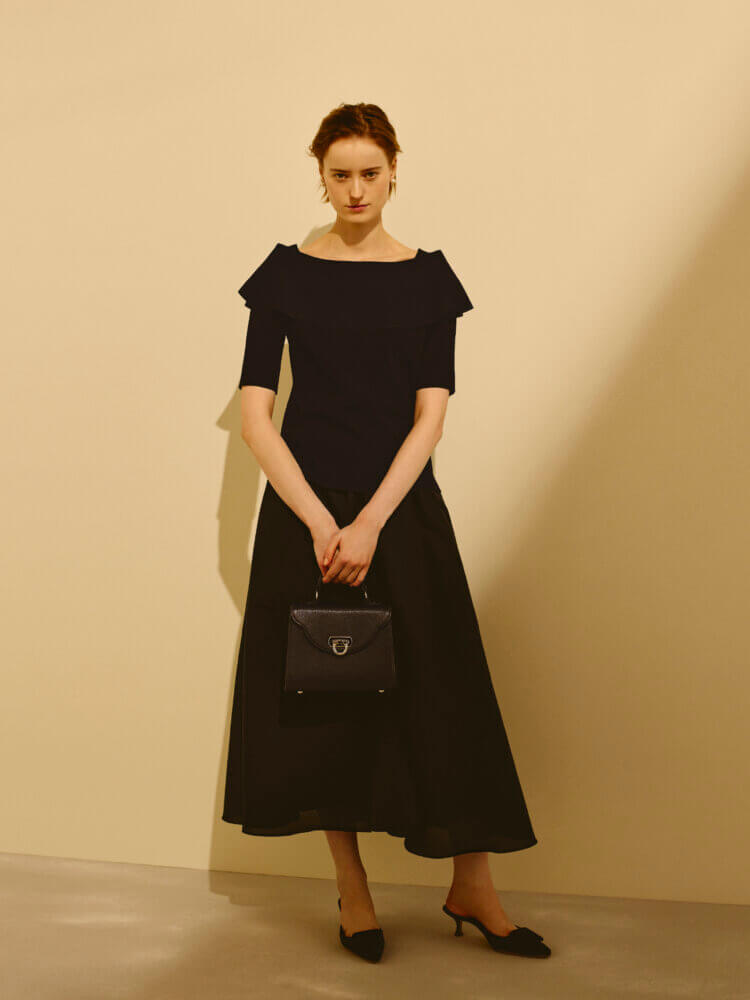 程よい落ち感と美しい表面感が、シンプルながらも洗練された印象を演出し、装い全体をエレガントに引き立てます。